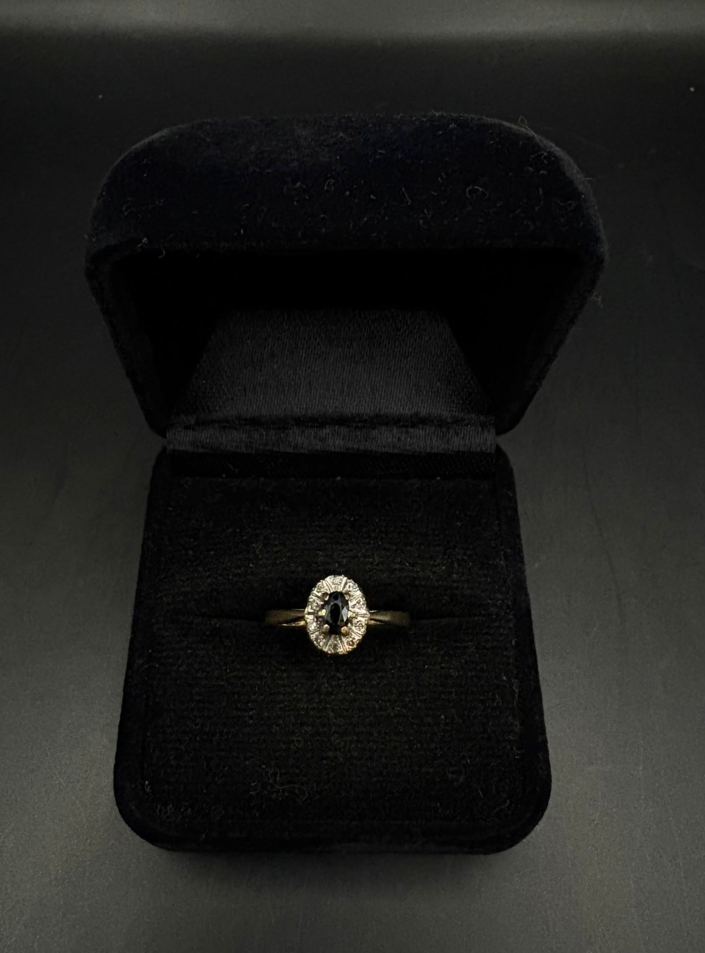 Kultainen Diana-sormus timanteilla ja sinisafiirilla. Erinomainen kunto, ei nimikaiverruksia. Materiaali: 585 (14K) Kulta, timantit 10kpl, sinisafiiri Paino: 1,76g Koko: 16