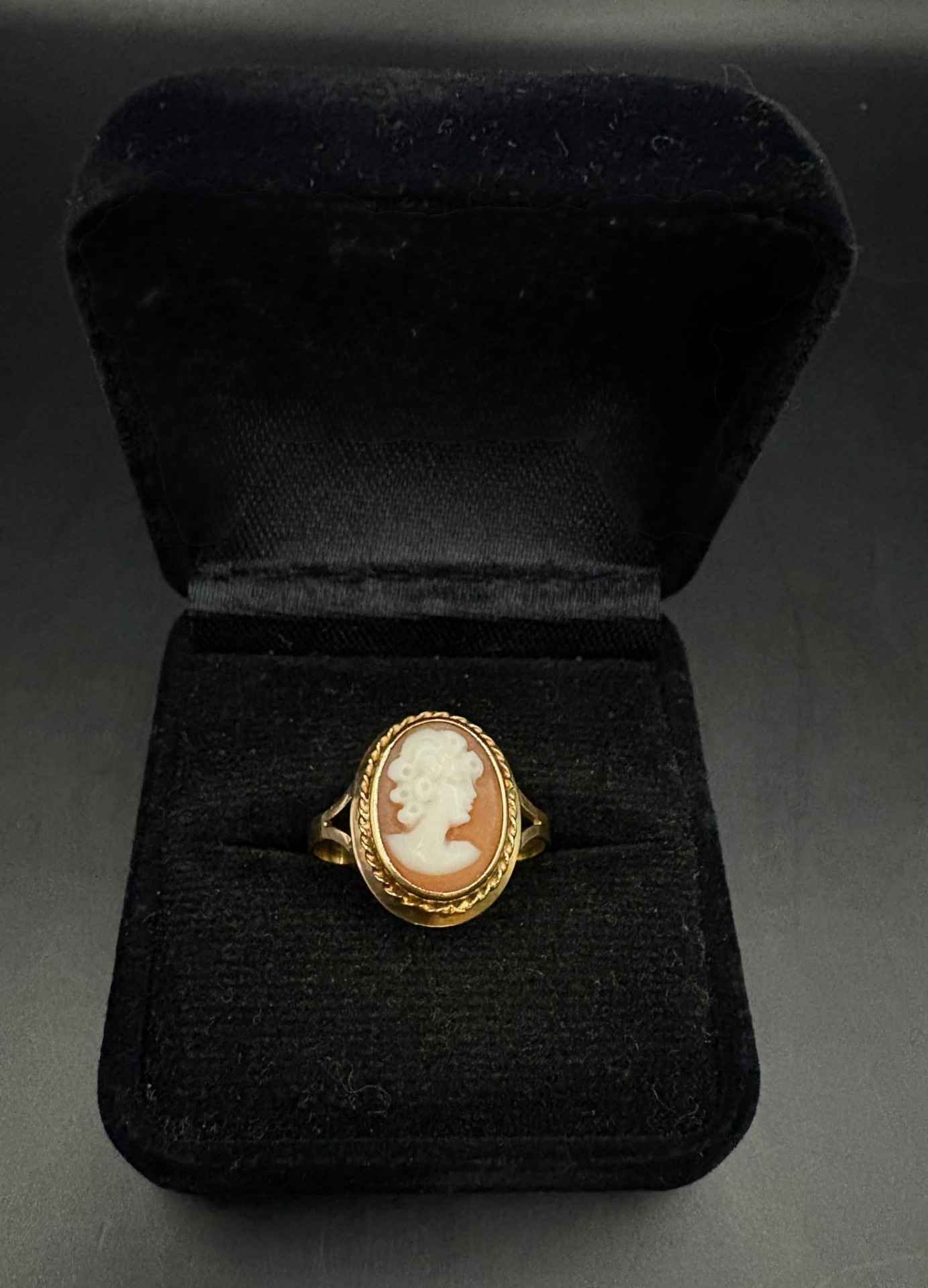 Erinomaisessa kunnossa oleva kultainen Camee-sormus. Ei nimikaiverruksia. Materiaali: 585 (14k) Kulta Muut leimat: LG, I8 Koko: 19, 1,3x 1,7cm Paino 2,3g
