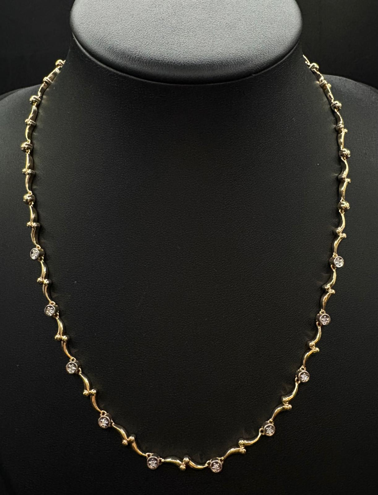 Upea kultainen timanttikaulakoru. Kunto erinomainen. Materiaali: 585 Kulta (14k) Pituus: 43cm Paino: 13,8g