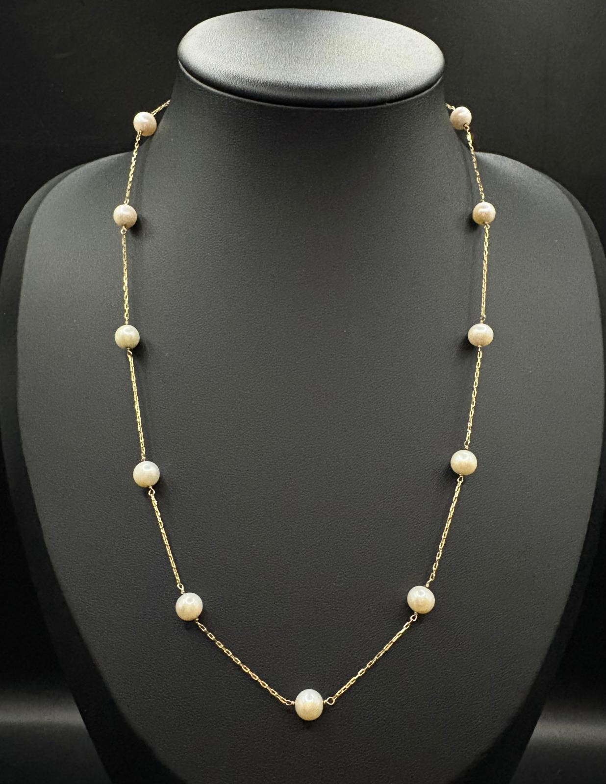 Kultainen kaulaketju helmillä. Materiaali: 585 Kulta (14k), helmet 12kpl Pituus: 45cm, helmi 5x5mm Paino: 4g