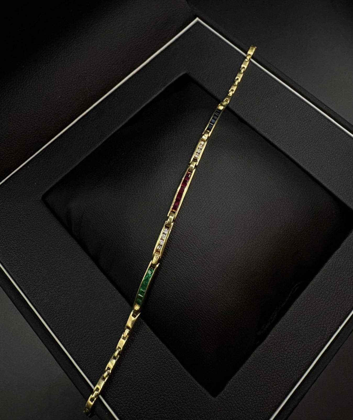 Kultainen rannekoru, jossa aitojen timanttien lisäksi vihreitä, punaisia ja sinisiä kiviä. Materiaali: 750 Kulta (18k), timantit 8kpl Pituus: 19cm Paksuus: 2mm Paino: 7,4g