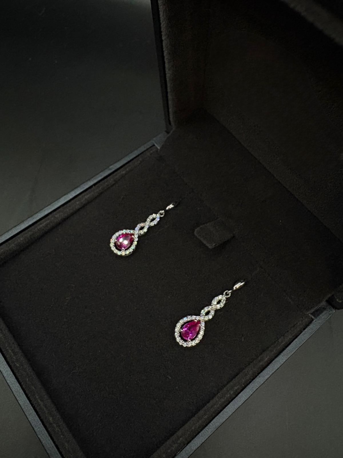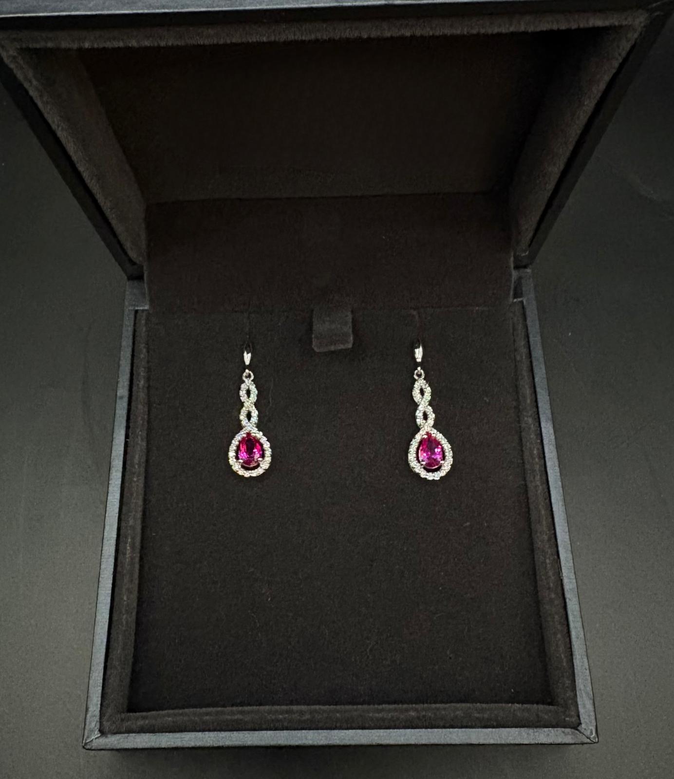 Hopeiset riippuvat korvakorut, joissa pieniä kirkkaita kiviä ja isompi pinkki kivi.