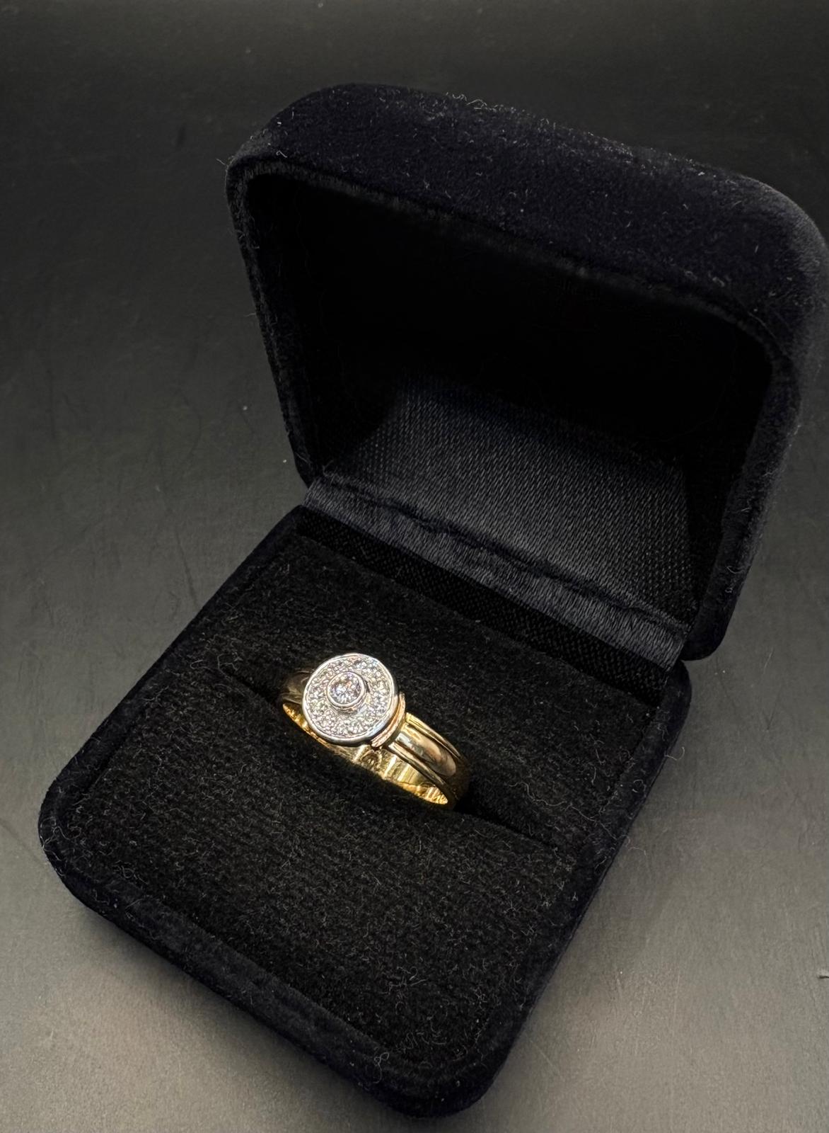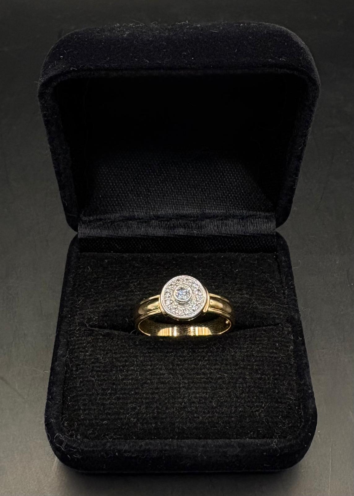 Kultainen timanttisormus, istutuksen keskellä yksi isompi timantti ja istutuksen ympärillä 12 pienempää timanttia.