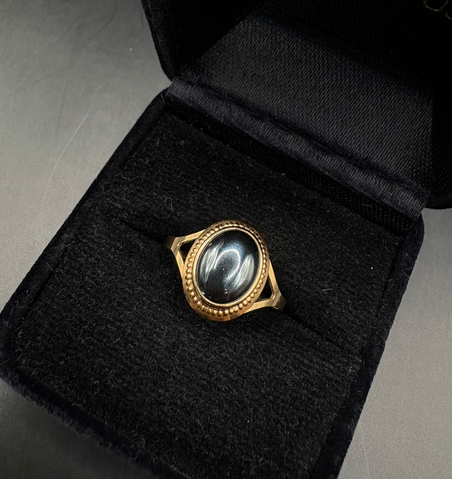 Kultainen sormus mustalla kivellä. Erinomainen kunto, ei nimikaiverruksia.